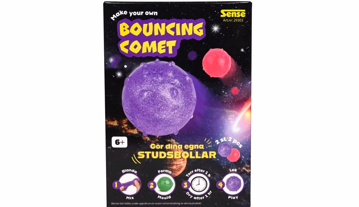 Med detta set kan du mycket enkelt göra två snygga studsbollar i lila och rosa. Det är superenkelt! Bara blanda, forma och invänta att studsbollarna ska härda. Därefter kan du se hur de färdiga bollarna studsar högt och sprider glädje. Allt du behöver ingår – en kreativ aktivitet som blir till timmar av lek och skoj!
