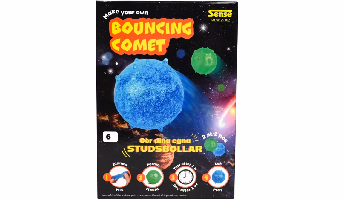 Med detta set kan du mycket enkelt göra två snygga studsbollar i blått och grönt. Det är superenkelt! Bara blanda, forma och invänta att studsbollarna ska härda. Därefter kan du se hur de färdiga bollarna studsar högt och sprider glädje. Allt du behöver ingår – en kreativ aktivitet som blir till timmar av lek och skoj!