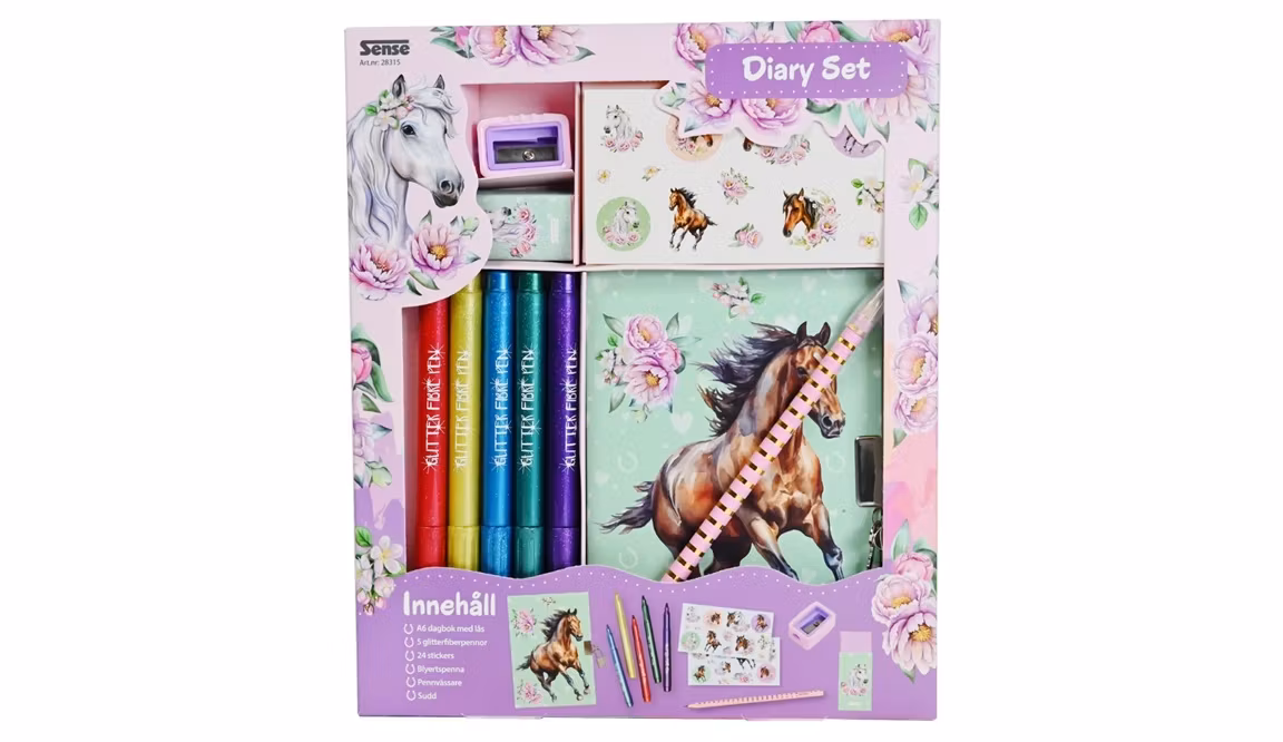 Dagboksset i häst-tema. Innehåller en dagbok med lås i A6. 5 stycken glittermarkers, 1 blyertspenna, 1 suddgummi, 1 pennvässare och 2 ark med fina motiv med häst stickers.